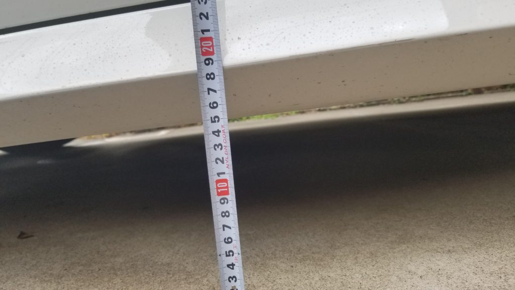 僕の車はサスペンションの交換で少しだけ車高が下がっています。フロントバンパー下の地上高は13cm。ドアの側面側でも15cm。このままでは下に入る事が出来ません。そのためまずは車高をあげない事には、車両の下に入ることもジャッキを入れる事も出来ません。そのためこのカースロープが必須となります。
